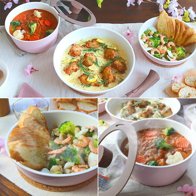 キッチンを明るくするやさしいピンクと木目調の取っ手がおしゃれなフライパン・鍋セットです。
