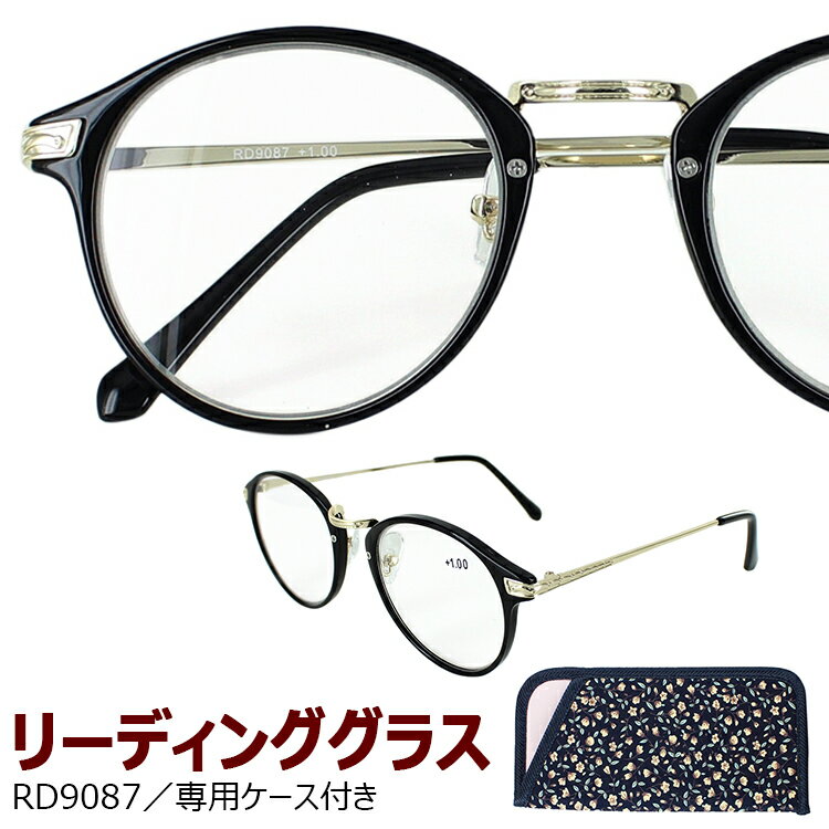 老眼鏡 おしゃれ レディース メンズ リーディンググラス シニアグラス RD9087 ファッションタイプ クリングス鼻パッド 調節可能 ボストン セル メタル コンビフレーム ブラック/ゴールド 3度数展開 1.0 1.5 2.0 男性 女性 40代 50代 ケース付き【定形外郵便で送料無料】