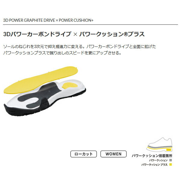 テクノロジー【3D POWER GRAPHITE DRIVE×POWER CUSHION⁺】3Dパワーカーボンドライブ×パワークッション、プラスソ−ルのねじれを3次元で抑え推カに変えるパワーカーボンドライブと全面に拡げたパワ−クッションプラスで跳り出しのスピード を更にアップさせる。