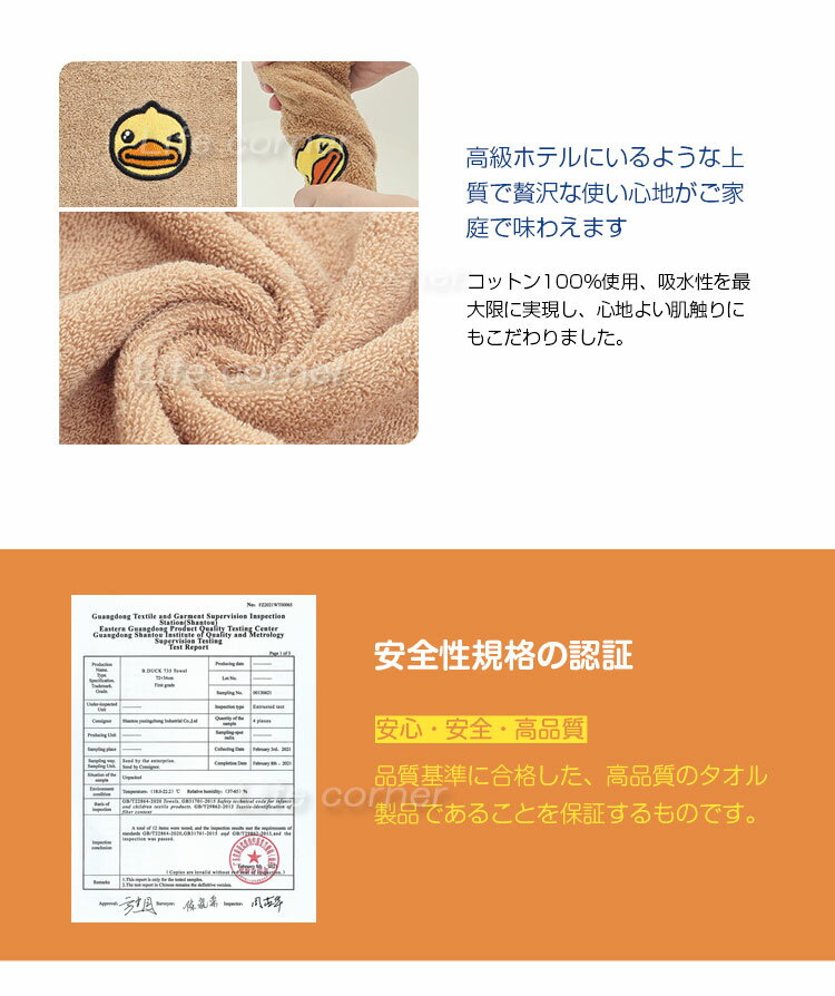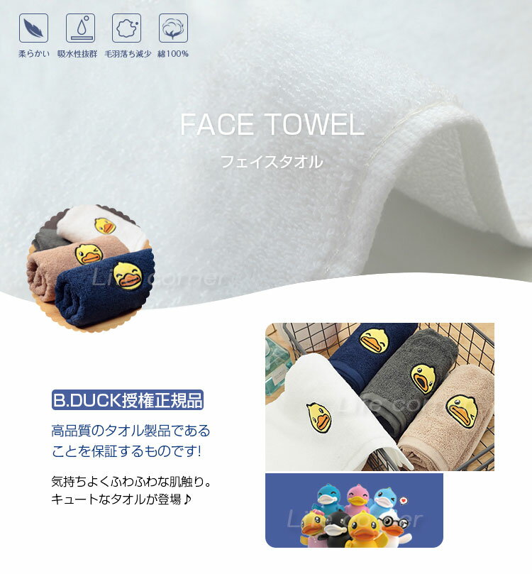 アイテム情報 商品仕様 商品名:B.DUCKフェイスタオル 入 数: 4枚セット サイズ: 約72*34cm/枚 色 : ホワイト、ベージュ、カーキ、ネイビー 用 途: 家庭用タオル 業務用タオル 子供用タオル 商品ポイント 1.細い糸で織られたこのタオルは、吸水性が抜群です。