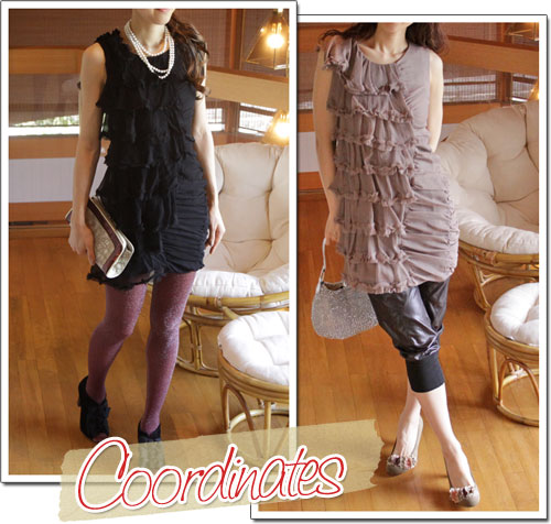 撮影時、ブラックの時は「スパンコールクラッチ」エクストラロングパールネックレス」「トリプルリボンブーティ」 シナモンカラーの時は「ペグトップパンツ」「グラデフラワーパンプス」をあわせています。