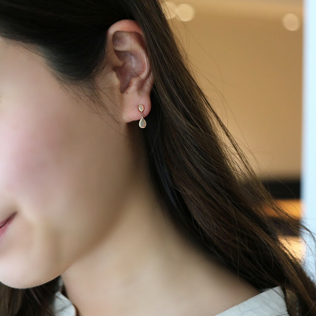 )虹色のしずくに、視線くぎづけ・・! エチオピア産オパール×K10ピンクゴールドピアス/イヤリング・リュリュアンネ >>K18はこちら<< 幻想的な遊色が鮮やかに浮かび上がる、 エチオピア産オパールを使ったロマンチックなピアス&イヤリングをおつくりしました!つややかなしずく形のジュエルを2つつなげてアレンジしたこちらのデザインは、カフェオリ内でも「使いやすくて好き」と好評なんです! 大活躍してくれること間違いなし・・!? 虹色の水滴を垂らしたかのような美しい輝きを堪能してください。