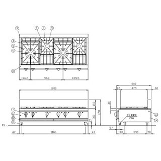 商品の仕様●外形寸法:W1200×D600×H300mm●トップバーナー個数:2重バーナー φ180(12000kcal/h)/2個 1重バーナー φ100(4000kcal/h)/2個●ガス消費量:13Aガス 37.2kw(32000kcal/h) ●ガス接続口径:20A●電気消費量100V:不要※商品画像はイメージです。