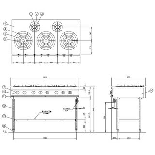 商品の仕様●外形寸法:W1200×D600×H800mm●トップバーナー個数:2重バーナー φ180(12000kcal/h)/3個 1重バーナー φ70(3000kcal/h)/2個●ガス消費量:LPガス 48.8kw(3.50kg/h)●ガス接続口径:20A※受注生産品※商品画像はイメージです。