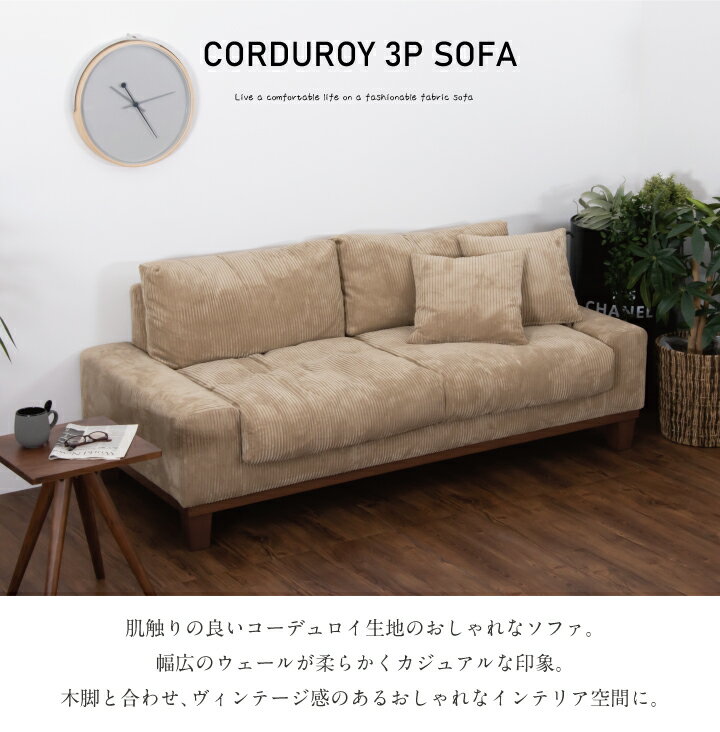 ソファ コーデュロイ 3人掛け ソファー 幅183 三人掛け 布地 ファブリック ブラック / カーキ ベージュ ブラック 北欧 モダン カジュアル お洒落 おしゃれ ヴィンテージ 脚付き ローソファ リビング コーディロイ 幅広 太 送料無料 通販 sanjp-0675