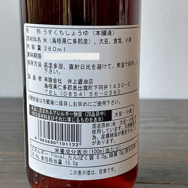 名称:うすくちしょうゆ(本醸造) 原材料名:米(島根県仁多郡産)、大豆、食塩、小麦 内容量:360ml×3本 保存方法:高温多湿、直射日光を避けて、常温で保存してください。